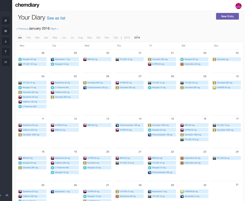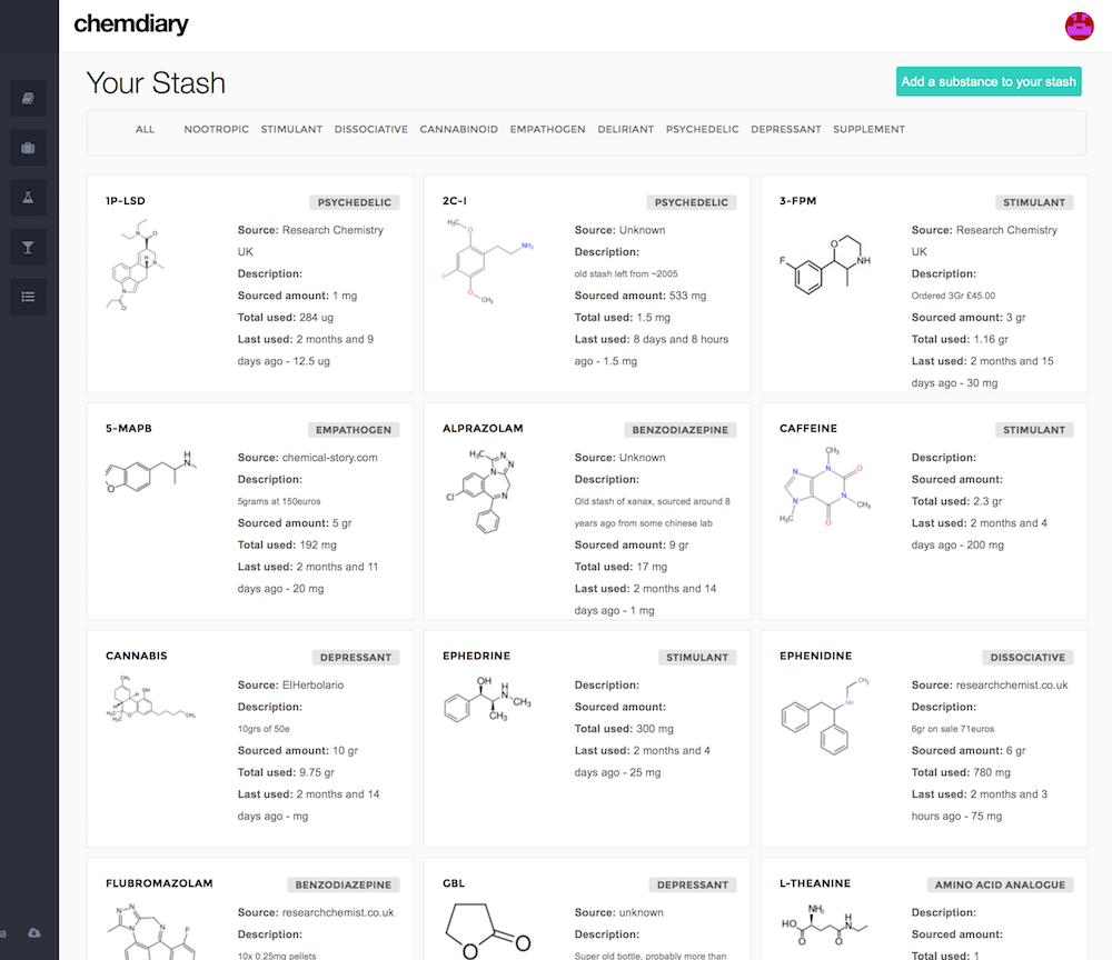 Chemdiary is a free and private website to track your use of drugs, research chemicals or other substances like nootropics. Most responsible drug users keep some kind of log, often on a notepad or txt file. Chemdiary tries to improve this log so you can get further insights on your use.